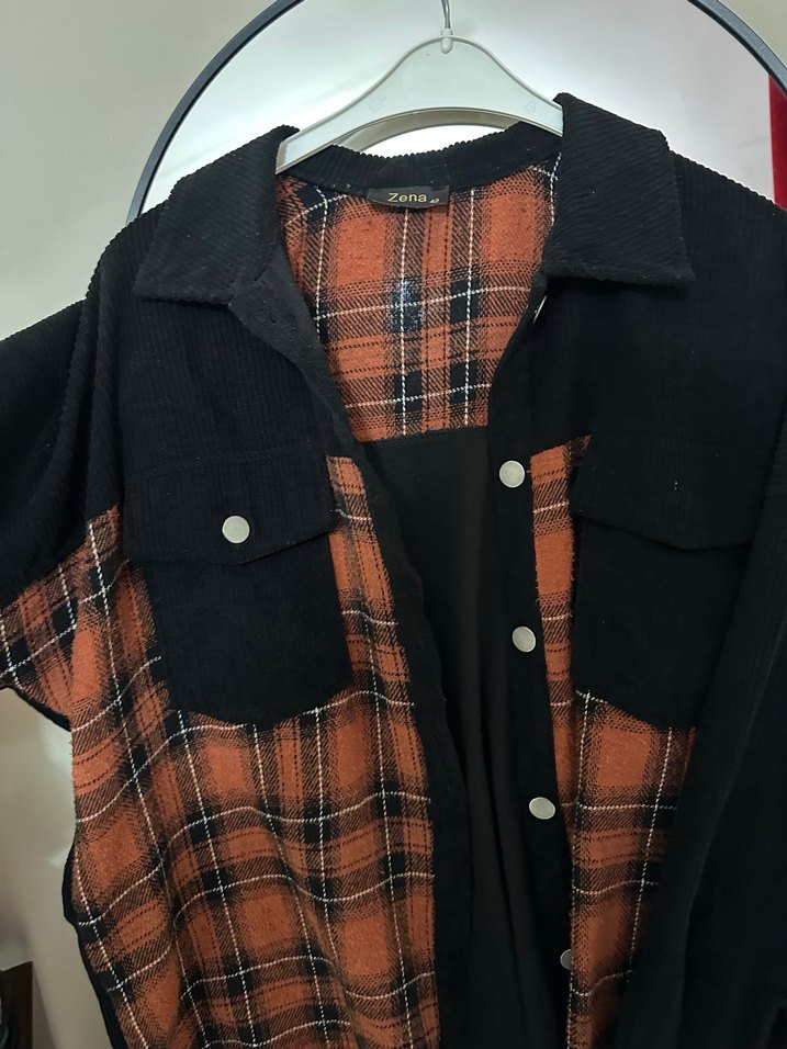 Düğmeli, uzun kollu ve kesik yaka detaylı, rahat kesim midi uzunlukta kahverengi kareli kadın gömleği. Günlük kullanıma uygun sokak stilinde.