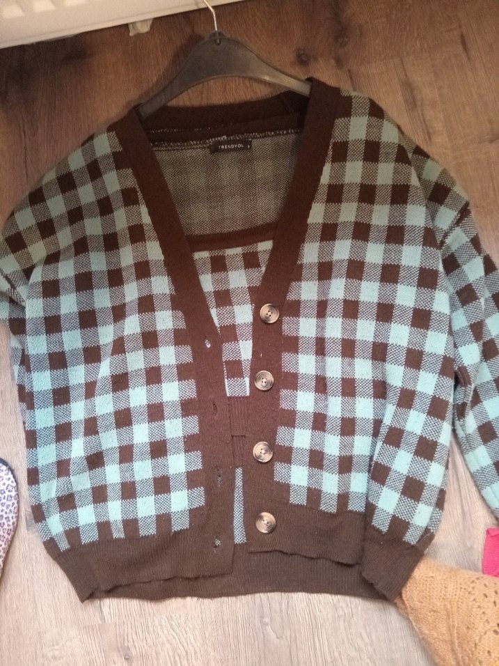 Düğmeli, uzun kollu, kareli kahverengi triko hırka. Rahat kesim, midi boy, günlük şık kullanım için uygundur.