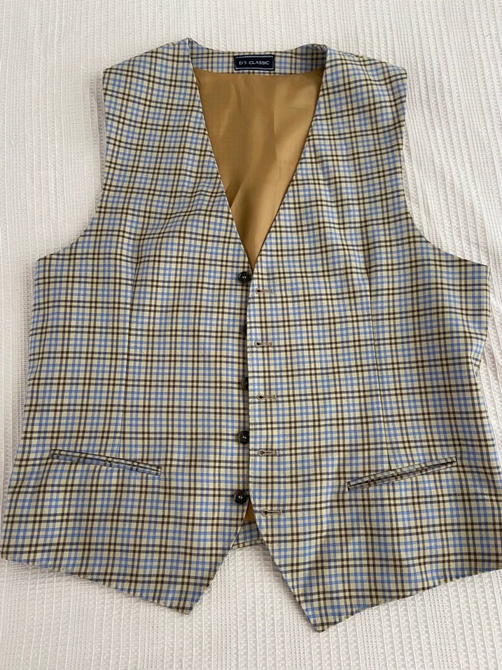 Düğmeli, kareli desenli, bej ve gri tonlarda klasik yelek. Kolsuz, normal uzunlukta ve regular fit, ofis kullanımı için uygundur. Tertemiz herhangi bir deform yoktur