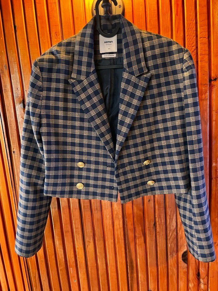Düğmeli, kareli kahverengi kadın ceket, normal kesim ve uzun kollu. Midi boyda, ofis ve sokak stiline uygun.