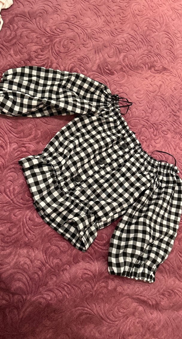 Düğmeli, kareli ve kısa boyda olan bu koyu renk bluz, tekne yaka ve askılı, salaş kollara sahiptir. Trendy sokak stili için uygundur.