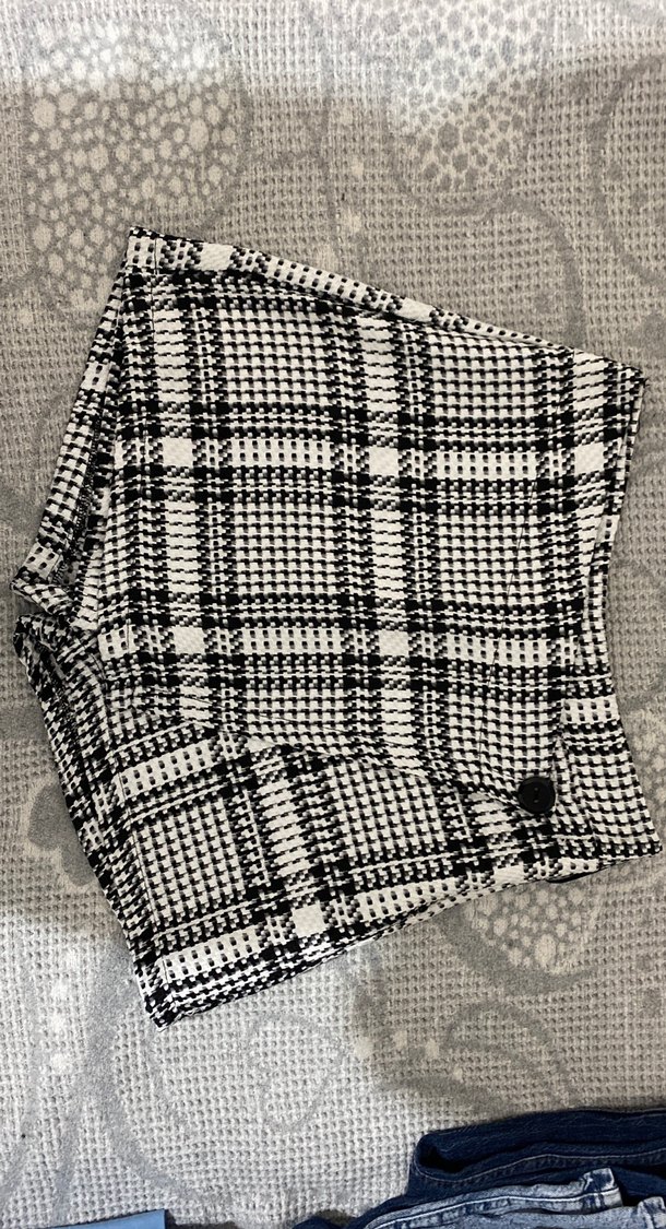 Gri tonlarda kareli desenli, düğme detaylı, sentetik kumaştan yapılmış, dar kesim mini etek. Dış mekan sokak stili için uygundur.