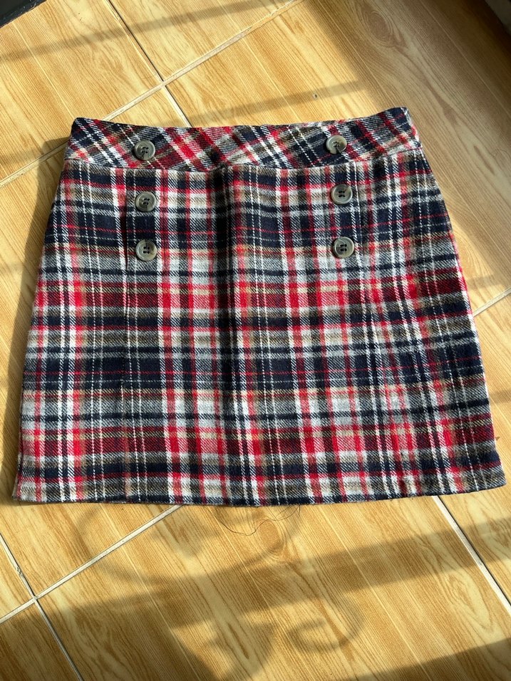 Düğmeli, kareli desene sahip mini kadın eteği. Kaşe kumaştır. günlük kullanıma uygun, rahat kesim. Koyu çok renkli deseniyle sıcak ve rahat bir görünüm sunar. Hiç kullanılmadı. İçi astarlı arkası fermuarlı.