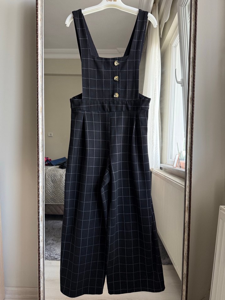 Uzunluk 134cm Koyu gri renkli, düğmeli, kareli desenli kadın tulum. Askılı ve straplez yaka detaylı, normal kesim uzunluk
