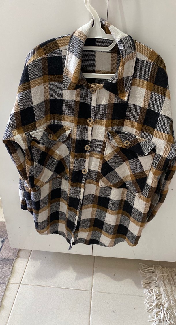 Düğmeli, uzun kollu, bol kesim unısex gömleği. Kahverengi ve gri kareli yumuşak dokulu kumaştan, günlük rahat kullanım için ideal #vintage. Ön düğmeli ve cep detaylı.alttan 2 düğme eksik kollar lastikli