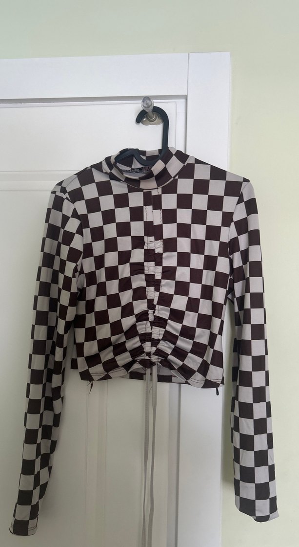 Düğmeli ön detaylı, kareli ve uzun kollu, yüksek yakalı, vücuda oturan midi boy bluz. Günlük kullanıma uygun sentetik kumaştan üretilmiştir.