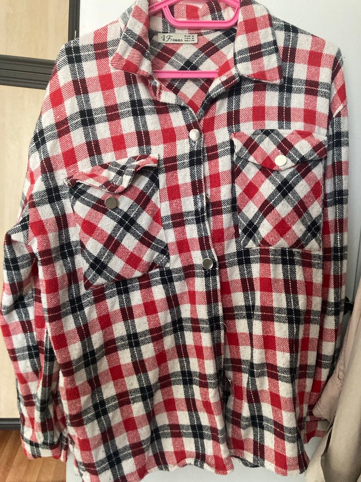 Kırmızı ve gri kareli desene sahip, düğmeli, uzun kollu ve yakalı salaş kesim kadın gömleği. Sentetik kumaştan üretilmiş, günlük rahat kullanım için uygundur.