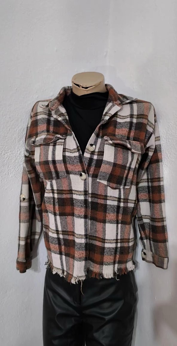 Kahverengi ve gri kareli desene sahip, düğmeli ve uzun kollu, kısa ve hafif yıpranmış kenarlı bol kesim kadın gömleği. Rahat günlük sokak stiline uygun. Marka/ambar