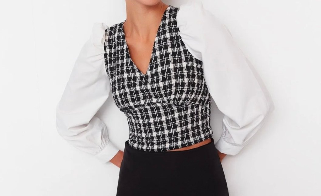 V yaka, düğmeli ve kareli siyah-gri üst kısmı olan, beyaz uzun kollu, kısa kesim kadın bluz. Ofis kullanımı için uygundur.