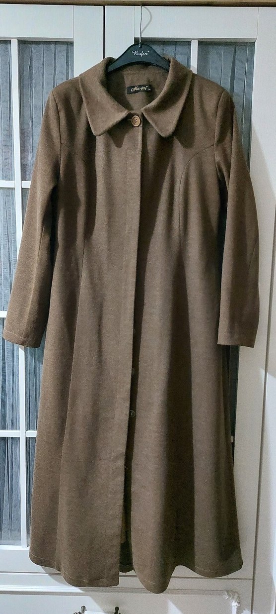 kahve renkli, düğmeli, uzun kesim kadın kaban. Yumuşak kaşe kumaştan, regular fit ve uzun kollu, sade ve rahat bir tasarıma sahip.