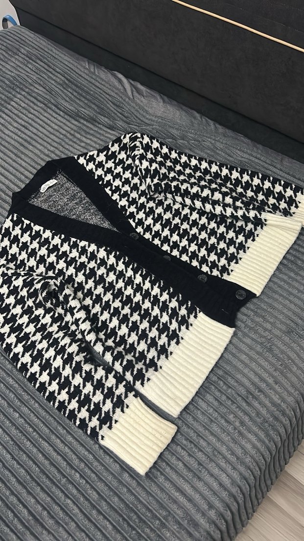 Kadın hırkası, örme dokulu ve siyah beyaz kazayağı desenlidir. Uzun kollu, düğmeli ve normal kesimdir. Manşet ve etek ucu ribanalıdır.