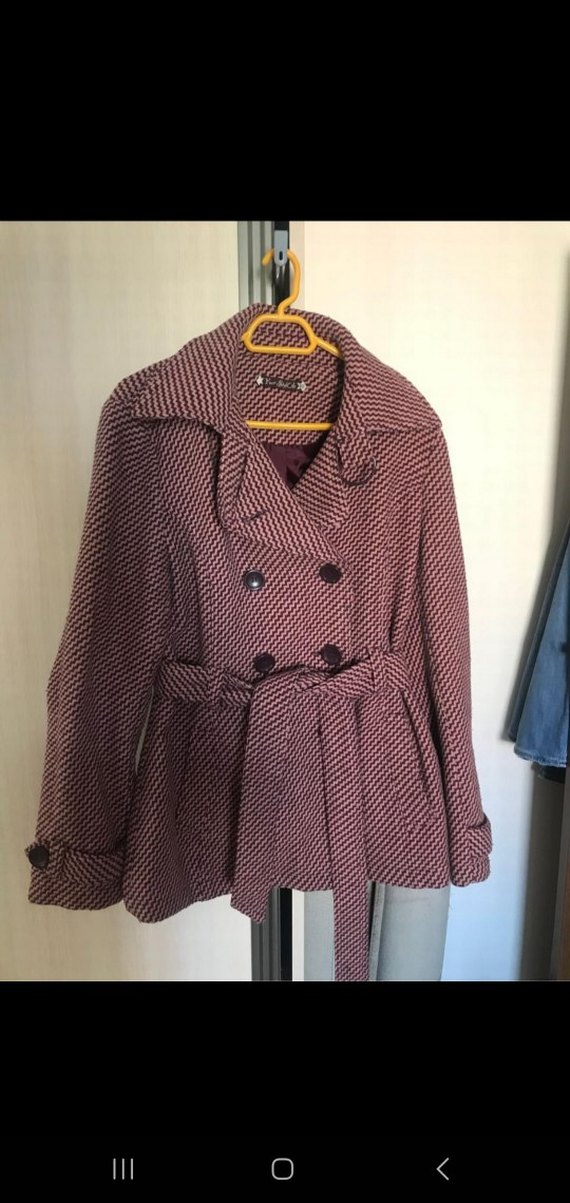 Düğmeli ve kemerli bordo kaban, uzun kollu ve geniş yakalı, hem şık hem sıcak tutar. Ürünün herhangi bir kusuru yoktur.