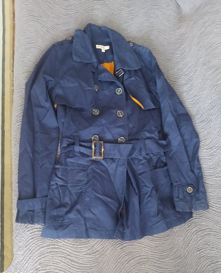 Düğmeli, uzun kollu, kemerli kadın lacivert trençkot.