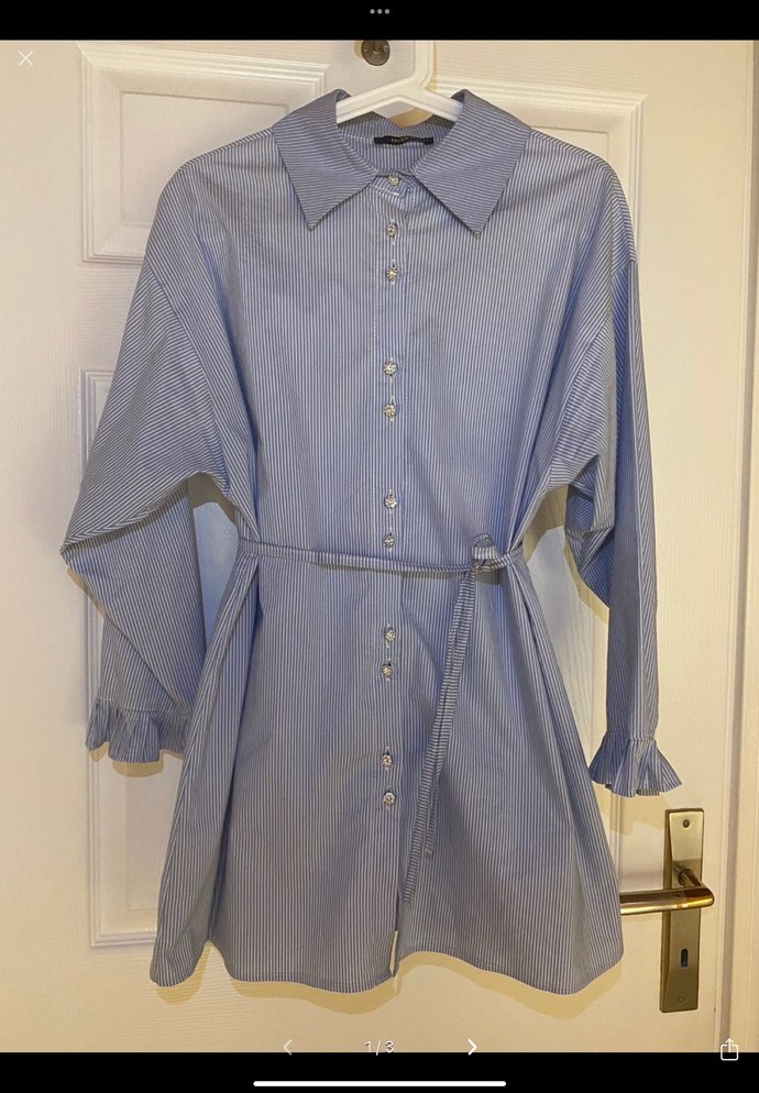 Düğmeli, kemerli ve bol kesim bu kadın keten gömlek, yakalı ve fırfırlı uzun kolludur. Yumuşak keten kumaştan yapılmış, midi boyda ve mavi-gri tonlarındadır.
