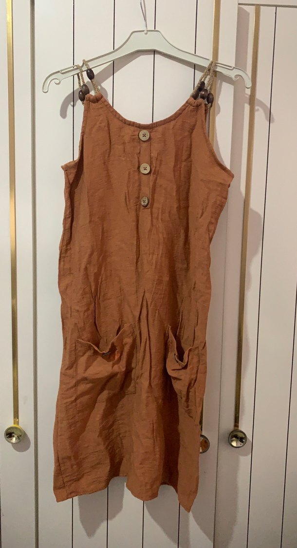 Düğmeli detaylara sahip, keten kumaştan, askılı ve bol kesim midi boy tulum. Günlük kullanım için uygun, koyu kahverengi tonlarında. kusuru bellidir