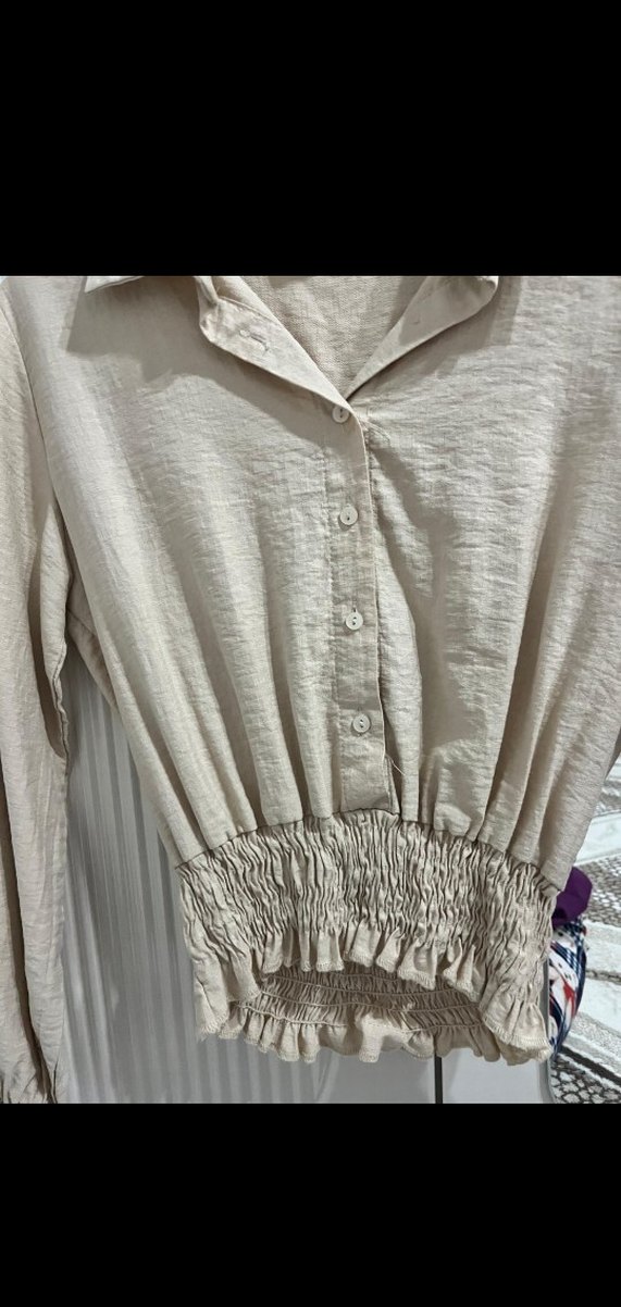 Bej keten kumaştan, düğmeli ve V yakalı uzun kollu mini gömlek. Beli toplanmış, bol kesimli ve bohem tarzda, gündelik kullanıma uygun.