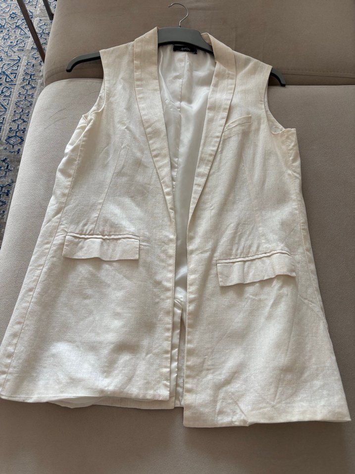 Düğmeli, keten kumaştan beyaz, kolsuz kadın yelek. Normal boyda, regular fit ve minimal tasarıma sahip, günlük kullanım için uygun.