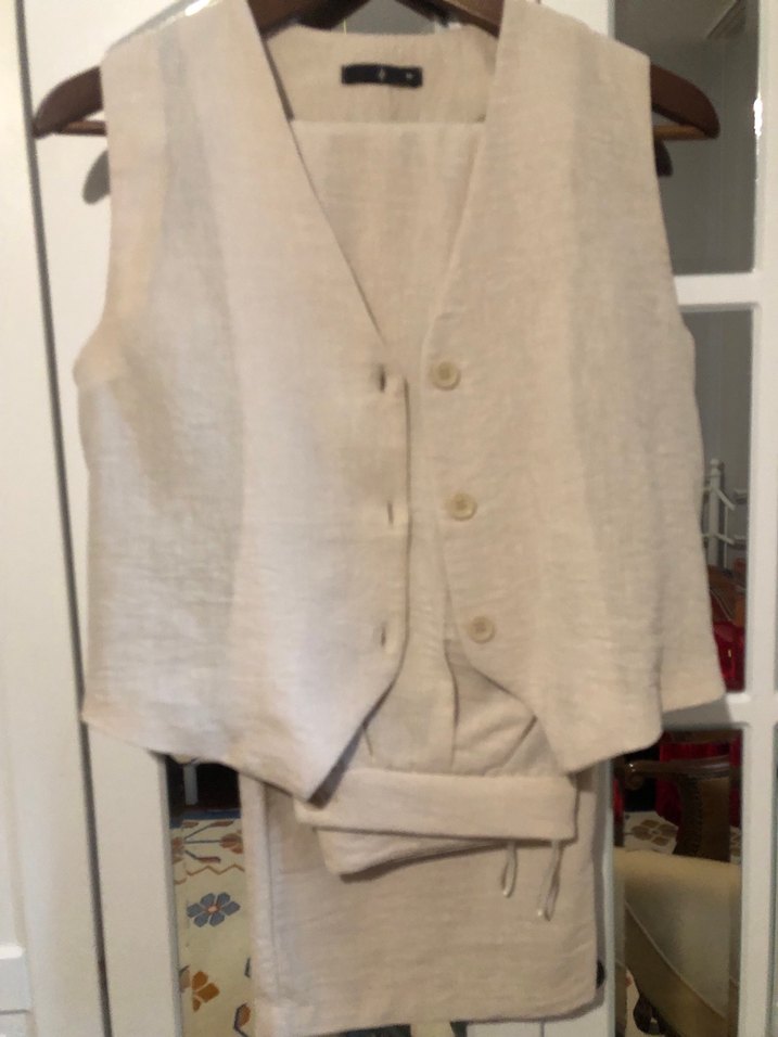 Düğmeli Keten Beyaz Kadın Yelek ve pantolon
