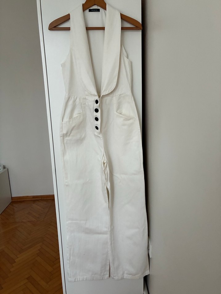 Düğmeli Keten Beyaz Midi Tulum