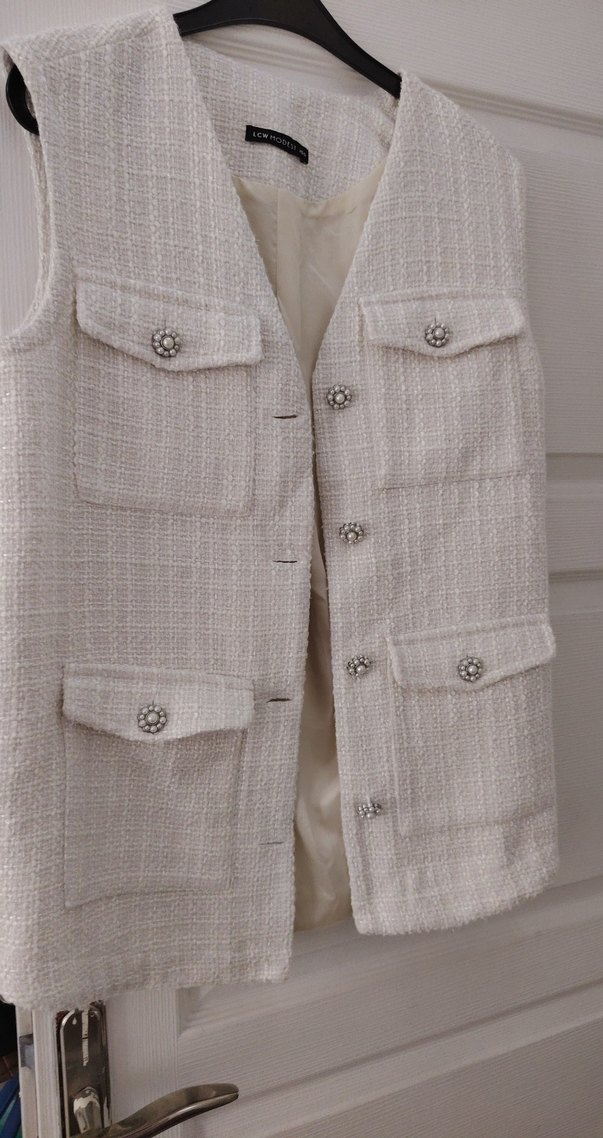 Düğmeli, kışlıkkumaç krem rengi hatta kırık beyaza yakın renk midi boy yelek. Kolsuz, kesik yaka ve çoklu cepleriyle günlük sokak stili için uygun görüldüğü gibi