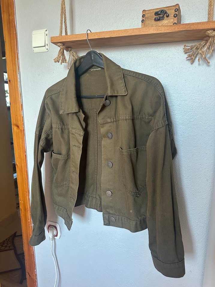 Haki yeşili keten kumaştan yapılmış, düğmeli ve notched yakalı, uzun kollu, midi boyda bol kesim kadın ceket. Günlük kullanıma uygun, desen içermeyen rahat bir model.