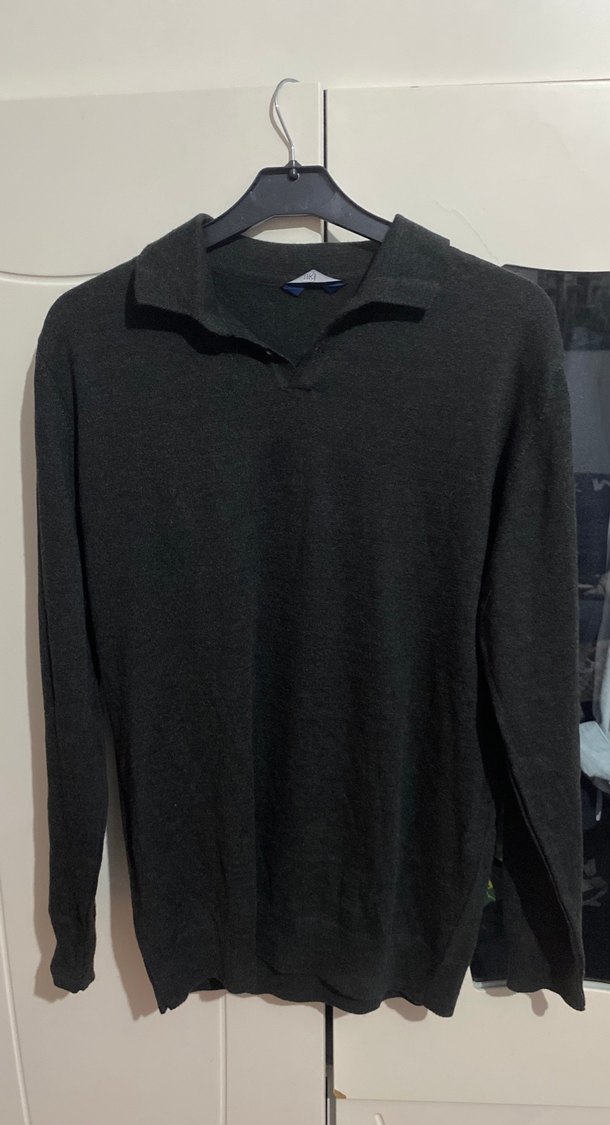 Düğmeli, keten kumaştan yapılmış, gri renkte uzun kollu, yakalı ve bol kesim erkek kazak.
