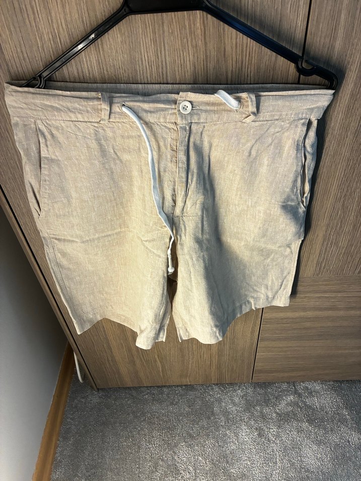 Bej renkli, keten kumaştan üretilmiş, düğmeli ve bol kesim erkek şort, günlük dış mekan kullanımı için uygundur.