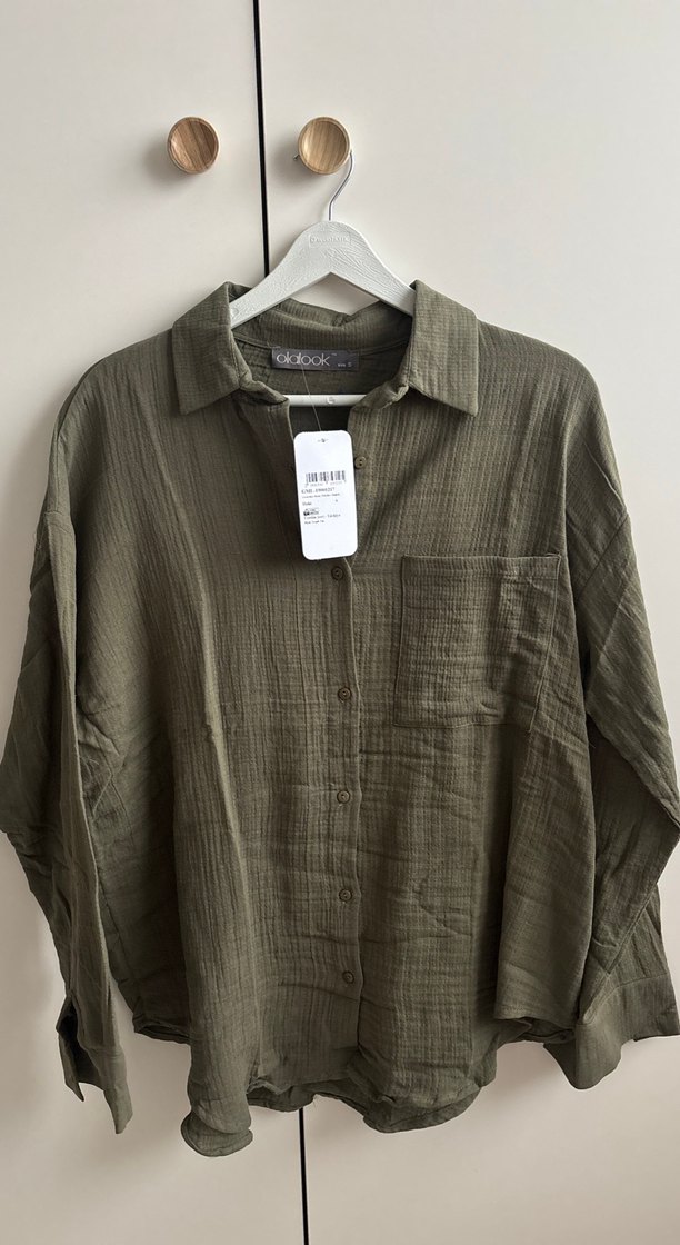 Hiç giyilmedi Düğmeli, uzun kollu, keten kumaştan, bol kesim ve yakalı haki gömlek. Tek cepli, gündelik rahat sokak stili. Marka temsilidir