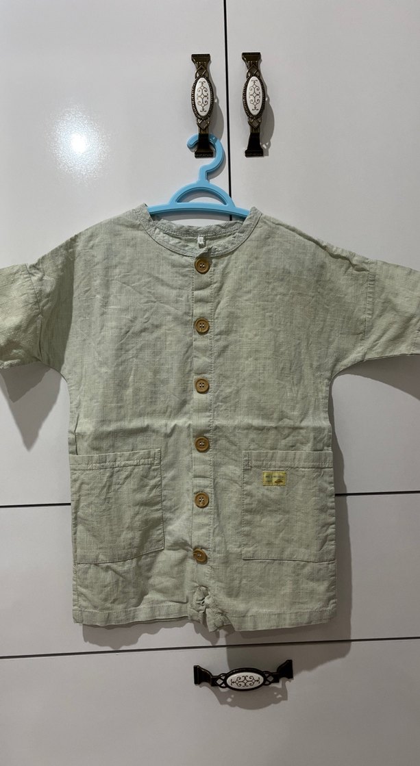 Kısa kollu, düğmeli, keten kumaştan gri bebek erkek tulumu. Bohem tarzda, yuvarlak yaka ve ön cep detaylı.