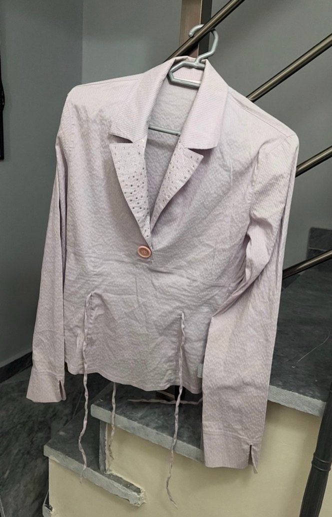 Gri keten kumaştan, düğmeli ve uzun kollu, notched lapel yakalı kadın gömleği. Normal uzunlukta ve regular fit, gündelik sokak stili için uygun.