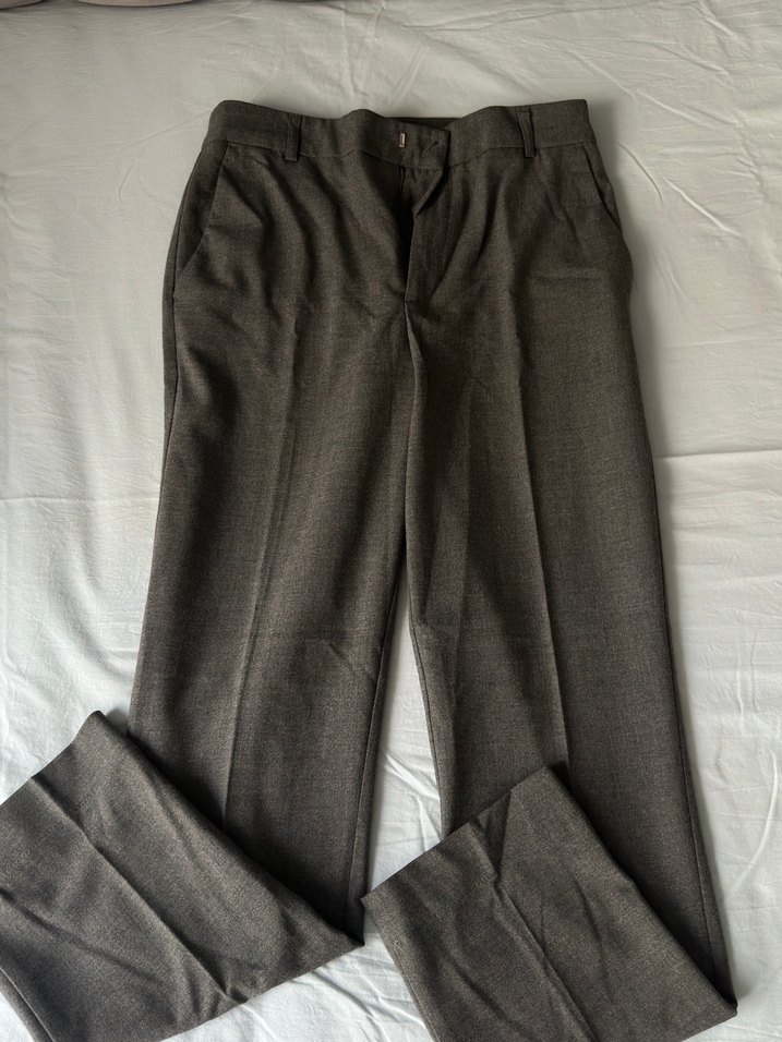Keten kumaştan yapılmış, düğmeli, gri renkte, normal kesim kadın pantolon. Ofis kullanımı için uygun, sade ve normcore tarzda.