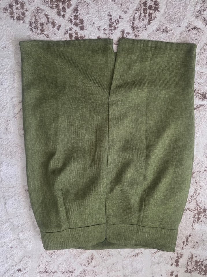 Bu haki keten kadın pantolonlar, düğmeli detaylara sahip ve normal kesimdir. Midi boyu ile ofis kullanımına uygundur, sade ve rahat bir stildir.