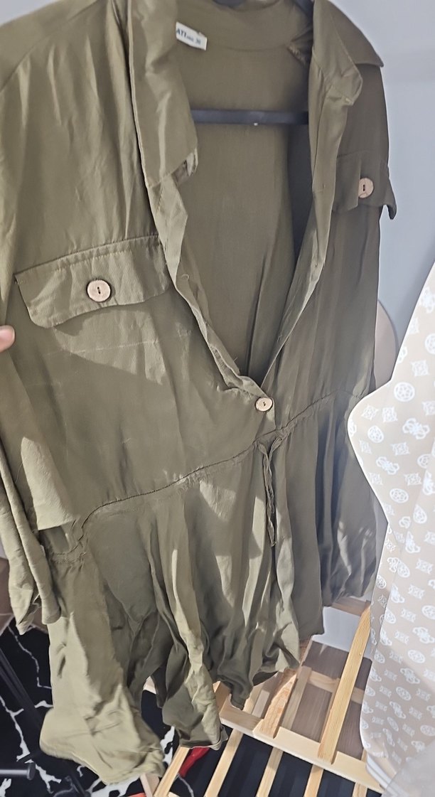 Keten kumaştan yapılmış, düğmeli, uzun kollu, yakası kesik ve bol kesim hamile midi ceket. Günlük rahat sokak stili için uygundur.