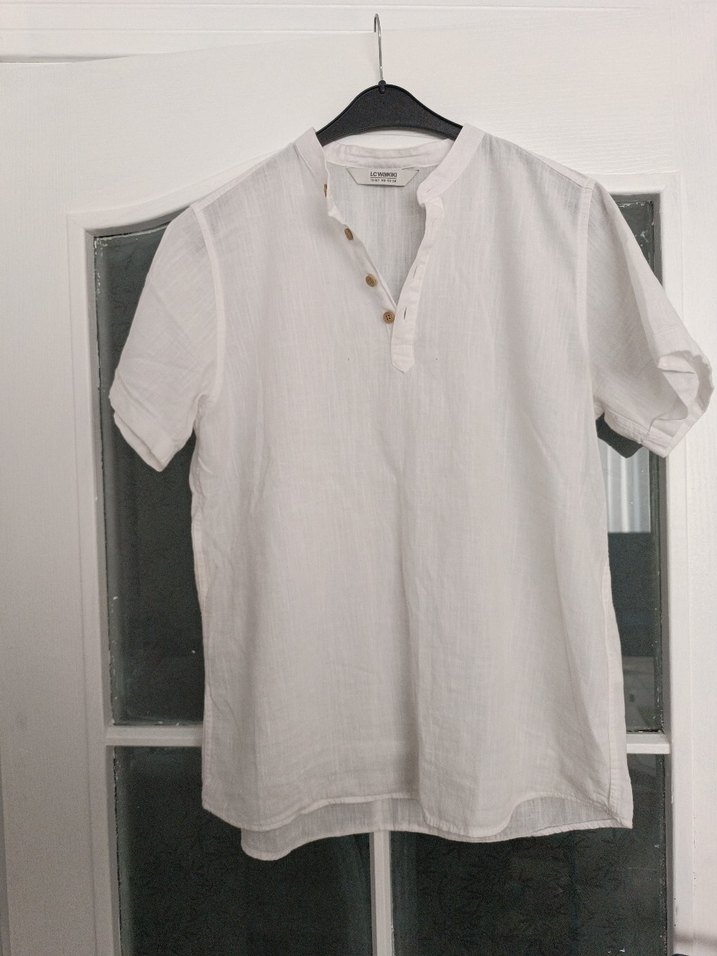 Bol kesim, kısa kollu beyaz keten gömlek. Yaka düğmeli ve minimalist bohem tarzda, günlük kullanıma uygundur.