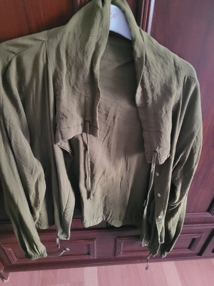 Keten kumaştan, düğmeli, uzun kollu, yakalı ve kısa boyda bol kesim kadın ceket. Günlük rahat kullanıma uygun bej renk, bohem tarzında.