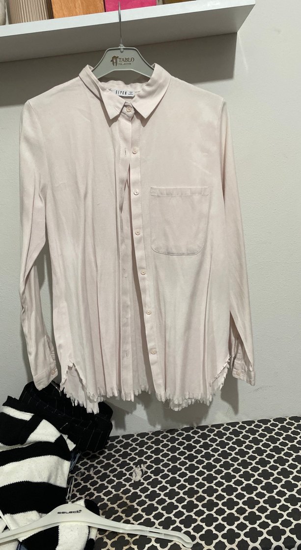 Pudra pembesi renkli, keten kumaştan uzun kollu kadın gömlek. Düğmeli, yakalı ve cep detaylıdır. Salaş kesimi ve midi boyuyla günlük rahat stil için uygundur.