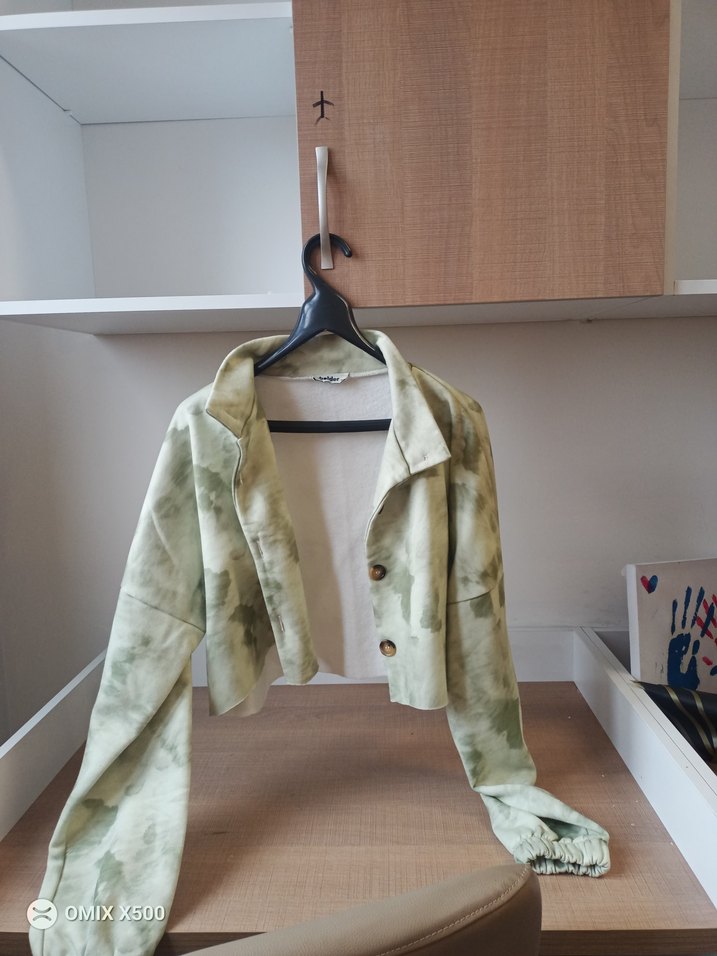 Düğmeli, keten kumaştan, bej renkli, notalı yakalı, pastel tonlarda batik desenli, uzun kollu, bol kesim kısa kadın ceket.