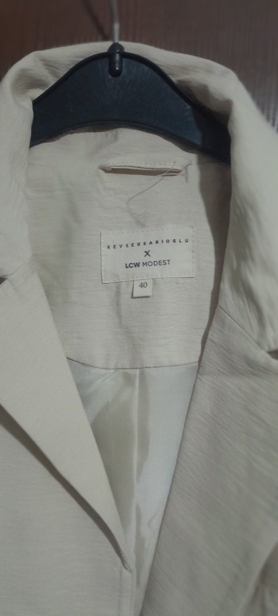 krem keten kadın ceketi, ve Düğmeli, orta boy ve düzenli kesimdir. Ofis için uygun, minimal ve sokak stili etkileri taşır. LCW MODEST etiketi bulunur.