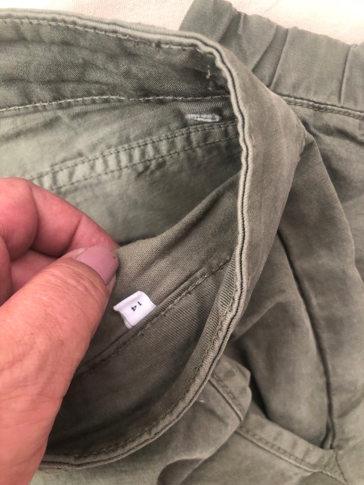 Düğmeli, keten kumaştan, bol kesim, midi boy, haki renk kadın kumaş pantolon. Günlük rahat kullanıma uygundur.