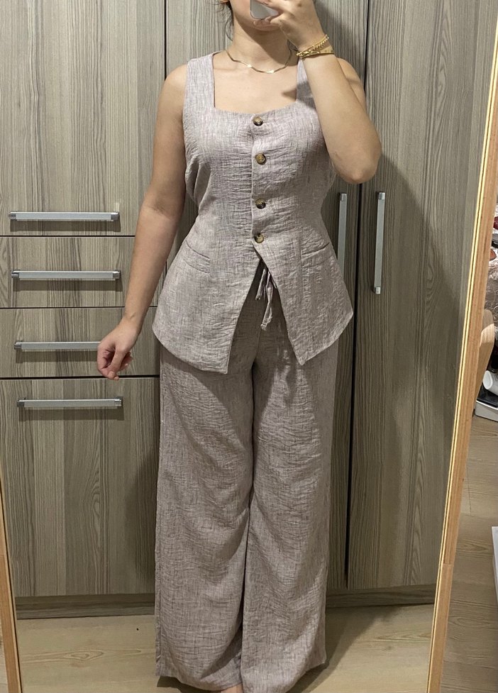 Düğmeli ön kısmı ve kesik yaka detaylı, keten kumaştan yapılmış, bej renkli, kolsuz kadın takımı. Normal boy ve regular fit kesime sahiptir. Ofis için uygundur. S beden ama m bedene de uygun