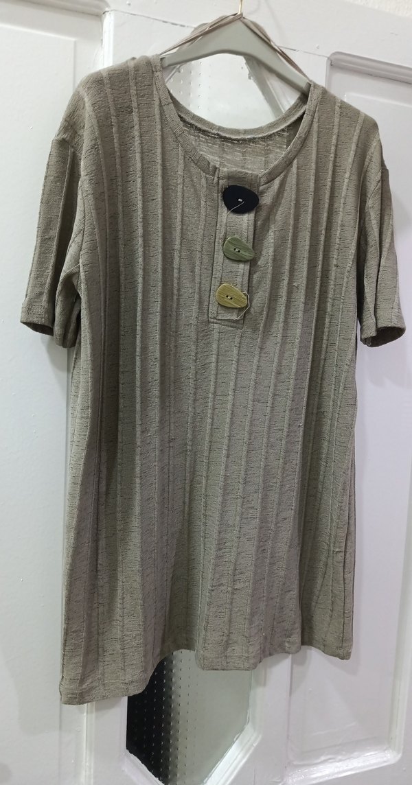 Keten kumaştan, kısa kollu, yuvarlak yaka ve düğmeli detaylı, bol kesim midi triko kadın elbisesi. Bej rengindedir, rahat ve gündelik kullanıma uygundur.