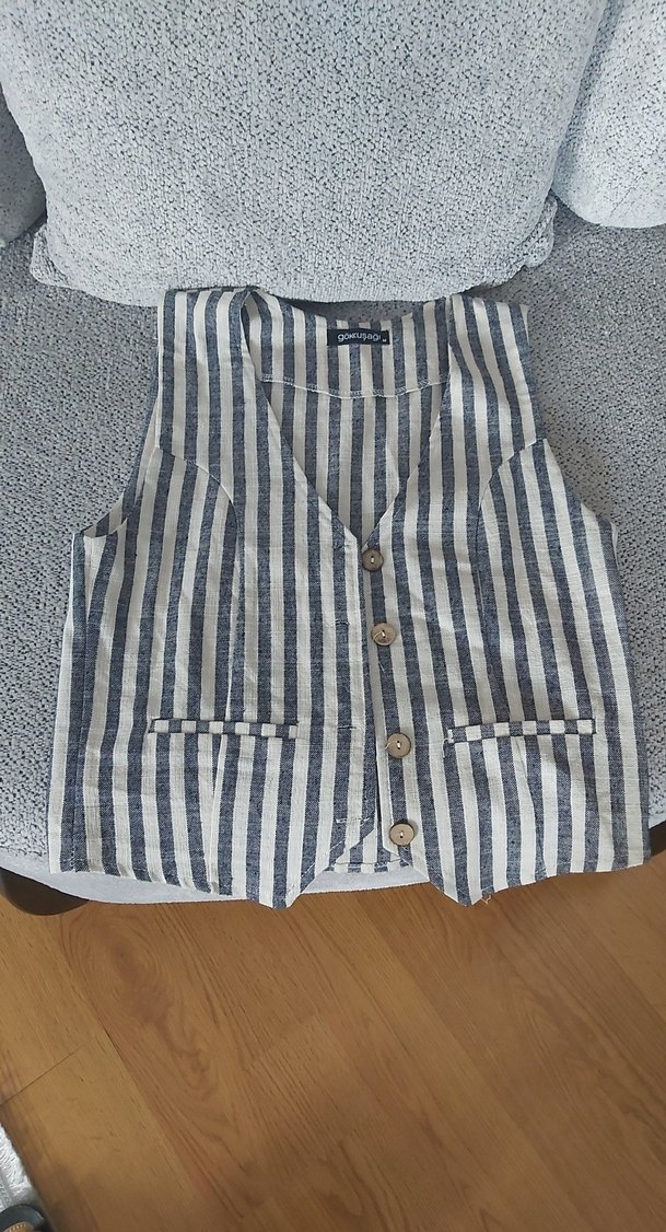 Nefes alabilen keten kumaştan, düğmeli ve yakalı kolsuz kadın yelek. Gri çizgili deseni ve ön cepleriyle gündelik kullanıma uygun, normal midi boyda, rahat kesim sokak stili yelek.