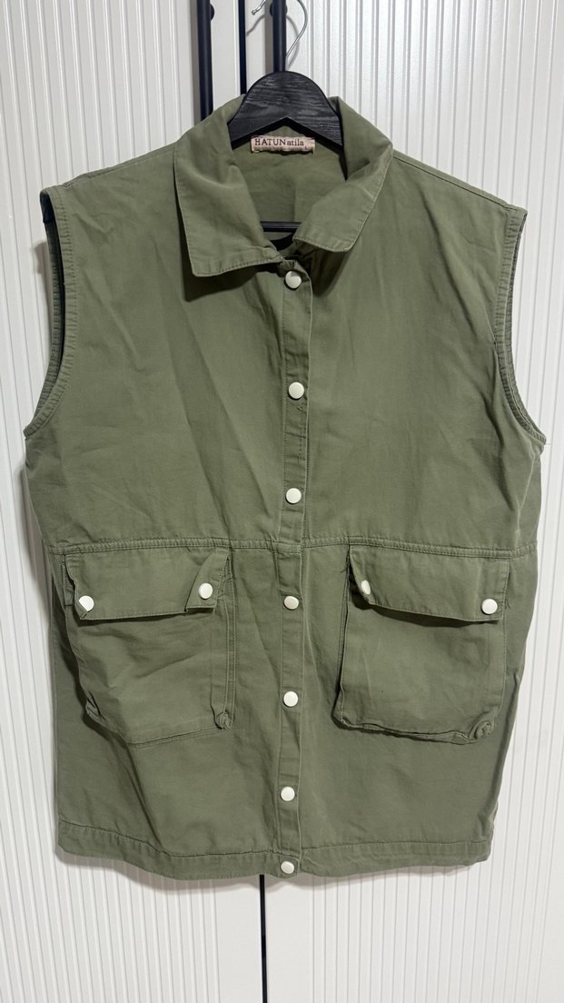 Keten kumaştan, düğmeli ve yakalı, salaş kesim, midi boy, cepli kolsuz kadın yeleği. Günlük rahat stil için uygun.