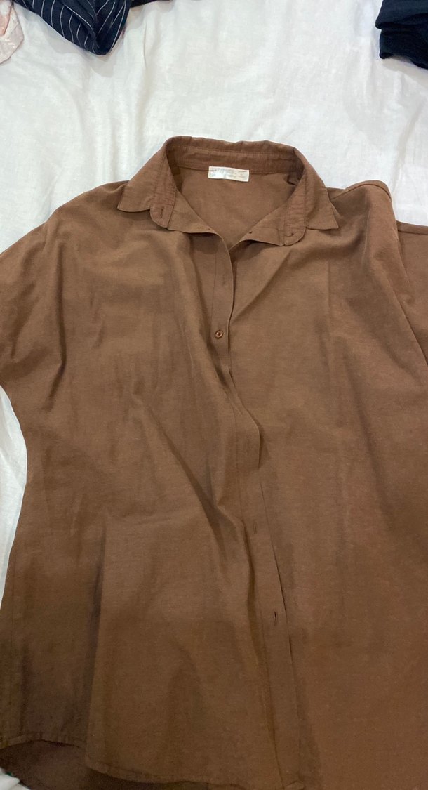 Düğmeli, kısa kollu, yakalı kahverengi keten gömlek, rahat kesim ve günlük kullanıma uygun.