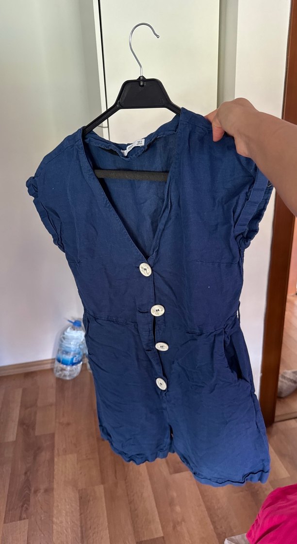 V yaka, düğmeli, kolsuz mavi keten tulum. Rahat kesimi ve midi boyu ile günlük sokak stili için uygundur.