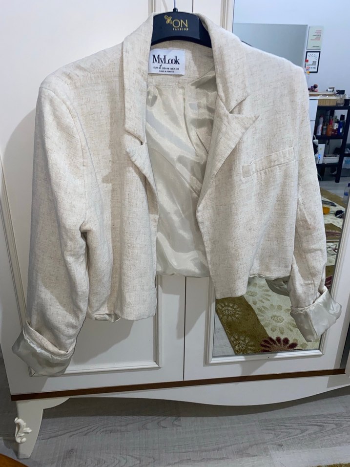 Gevşek kesim, keten kumaştan, düğmeli beyaz blazer. Uzun kollu ve midi boy, günlük kullanım için uygun.