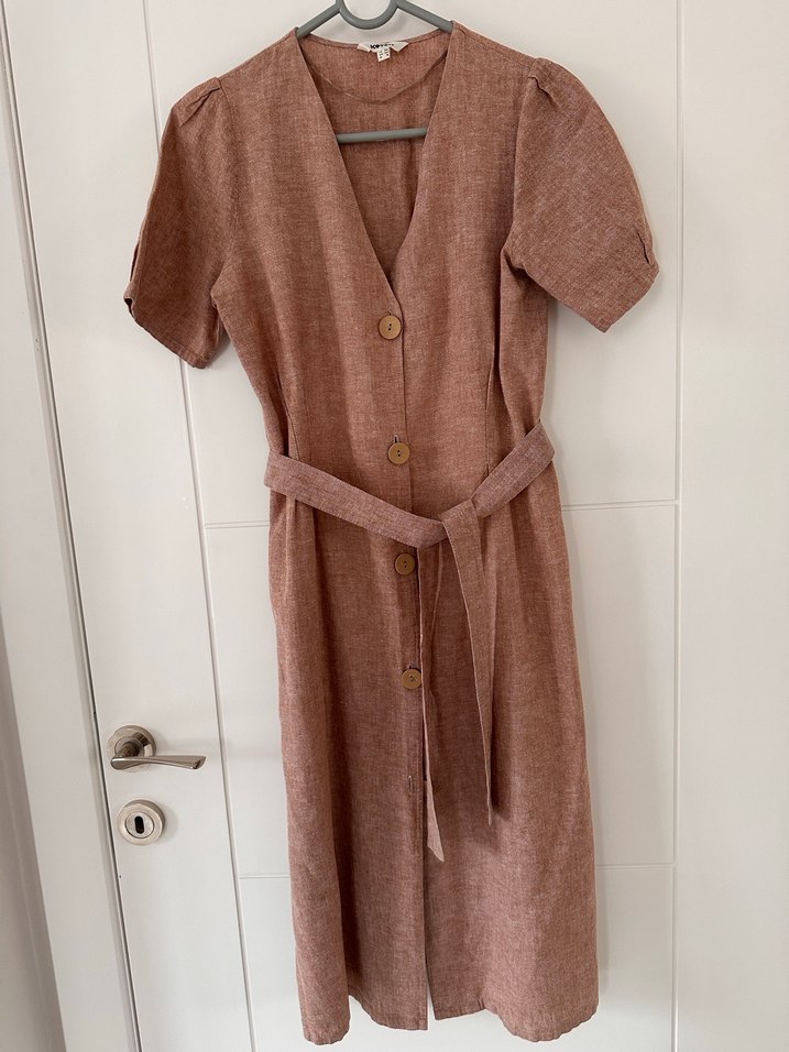 Yumuşak keten kumaştan, düğmeli ve kuşaklı, kısa kollu, notlu yaka midi elbise. Rahat ve salaş kesim. Tam bir giy çık yaz elbisesi keten kumaş rengi fotoda tam olarak yansımıyor aslında tam bir gül kurusu soft renk çok güzel üç kez giyildi