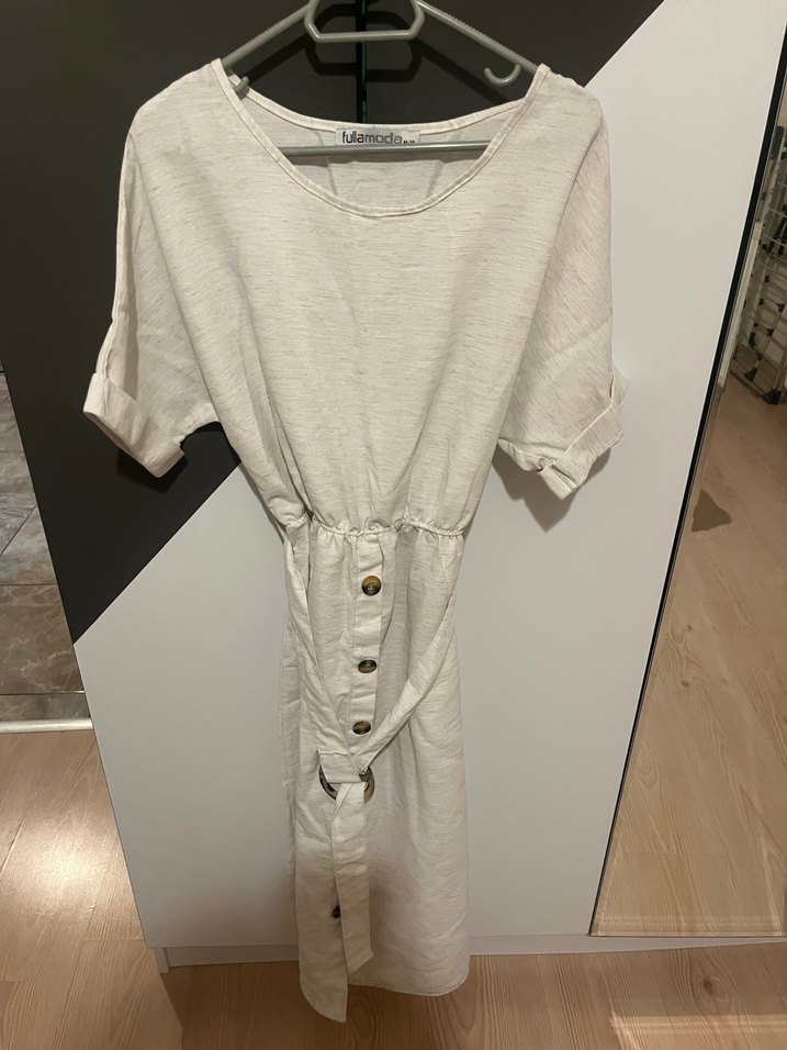 Yumuşak keten kumaştan, düğmeli ve kısa kollu, salaş kesim midi elbise. Günlük kullanıma uygun, bohem tarzda bej renkli.