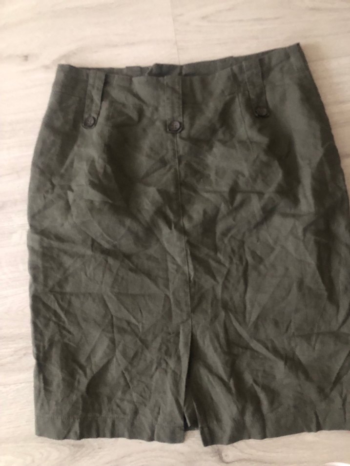 Keten kumaştan yapılmış, düğmeli, fitted kesim, haki renk midi etek. Minimalist, desen içermeyen tasarımı ofis kullanımı için uygundur.