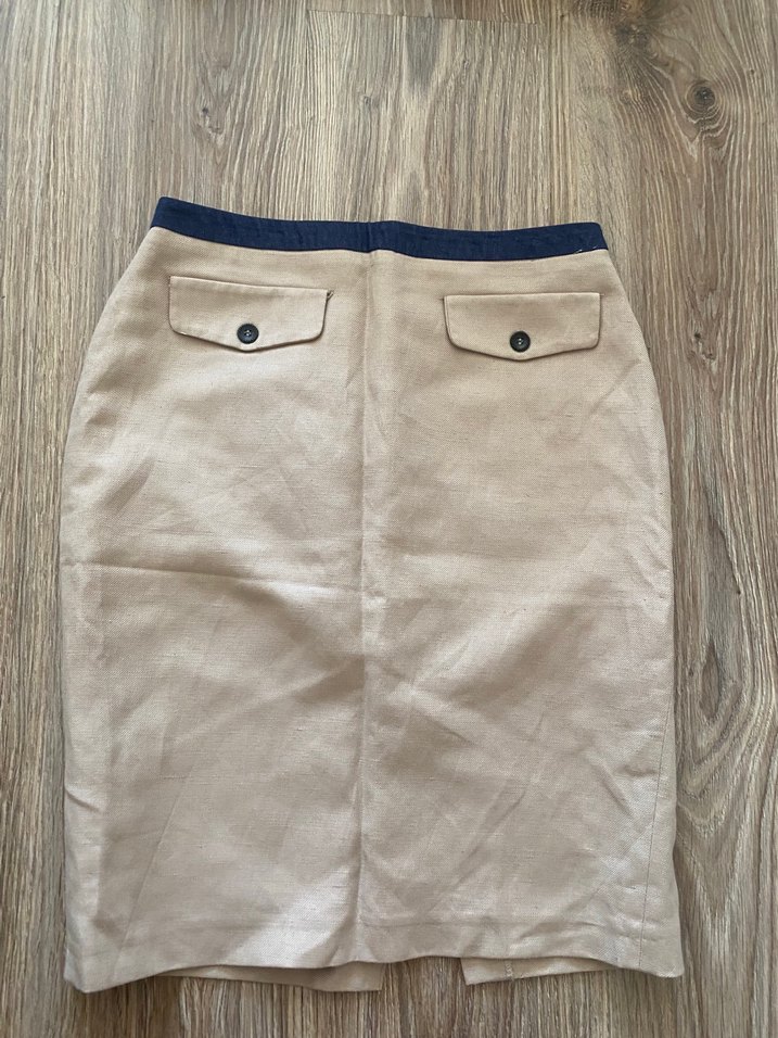 Düğmeli arka cepli, keten kumaştan yapılmış bej midi kalem etek. Ofis için uygun, rahat kesim ve sade tarz.